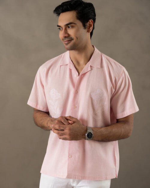 Botanic Bloom Box-Fit Embroidered Linen Shirt in Pearl Pink