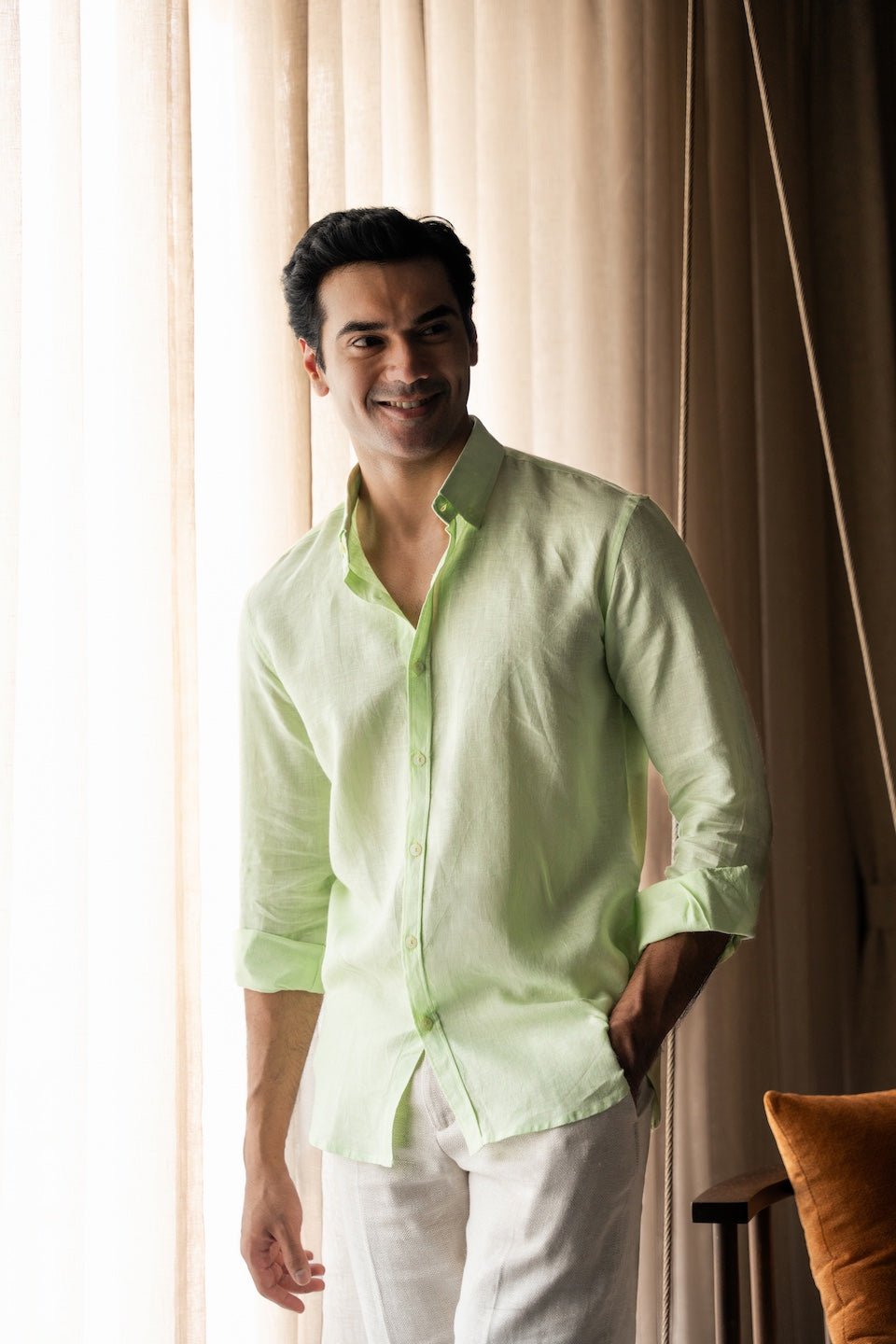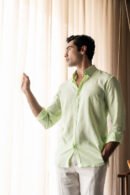 The long-sleeve Frosty Peppermint shirt is crafted from lightweight, breathable linen fabric, enzyme washed for an extra soft touch—perfect for both semi-formal and casual occasions.