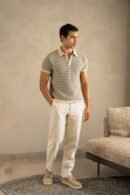 The fine horizontal jacquard knit features a warm clay-beige palette, offering both visual depth and a refined, tactile finish. With a classic polo collar and tailored silhouette, this piece is ideal for effortless dressing — from slow Sundays to smart summer evenings.