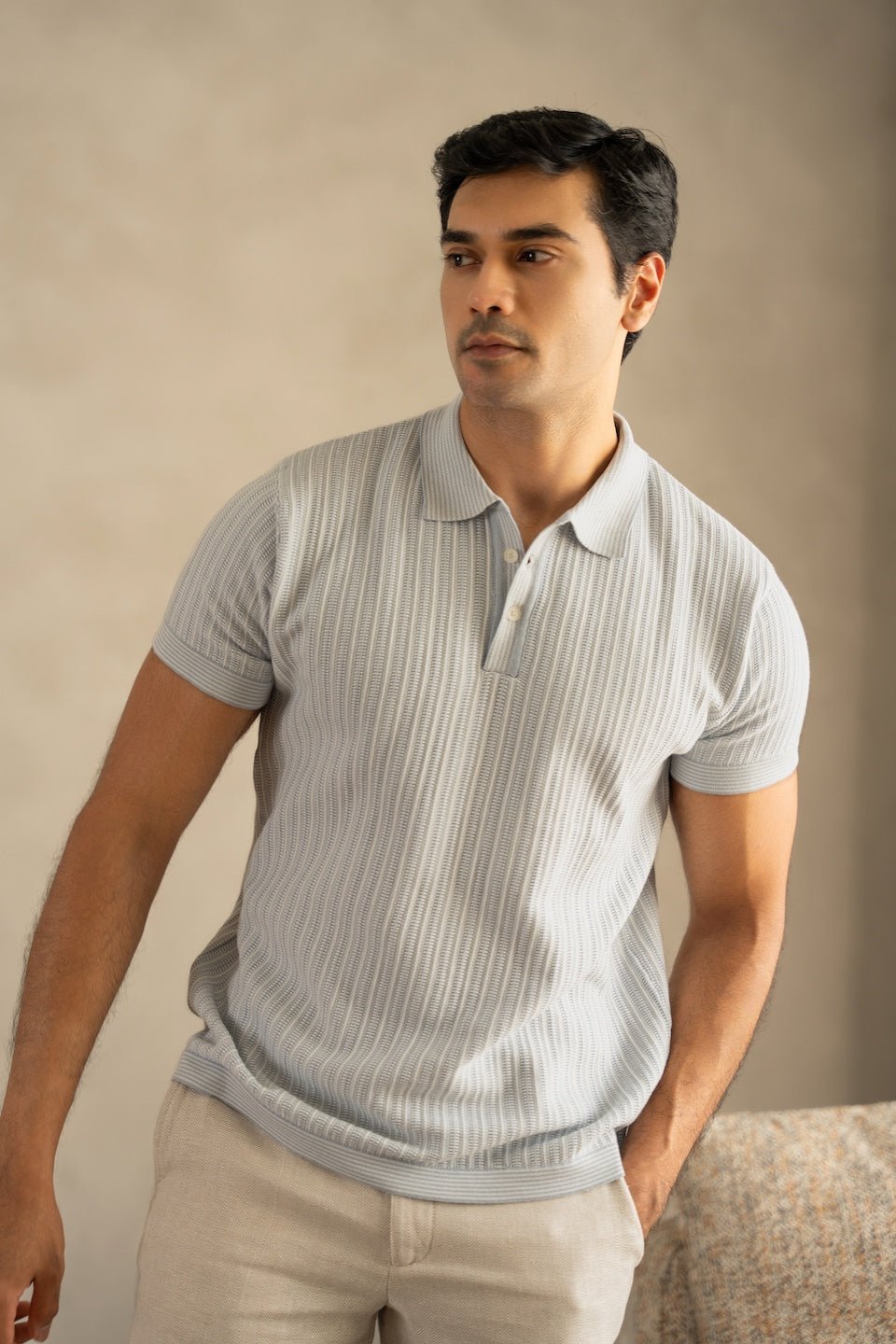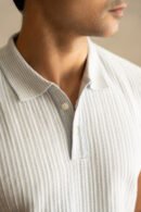 The vertical jacquard rib knit lends a clean, elongated silhouette, while the icy pastel tone adds a touch of understated sophistication. Finished with a structured collar and tailored fit, it’s designed for those who value quiet luxury and effortless polish.